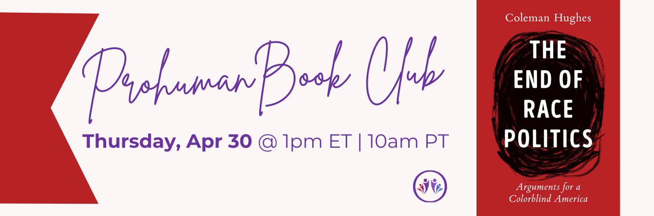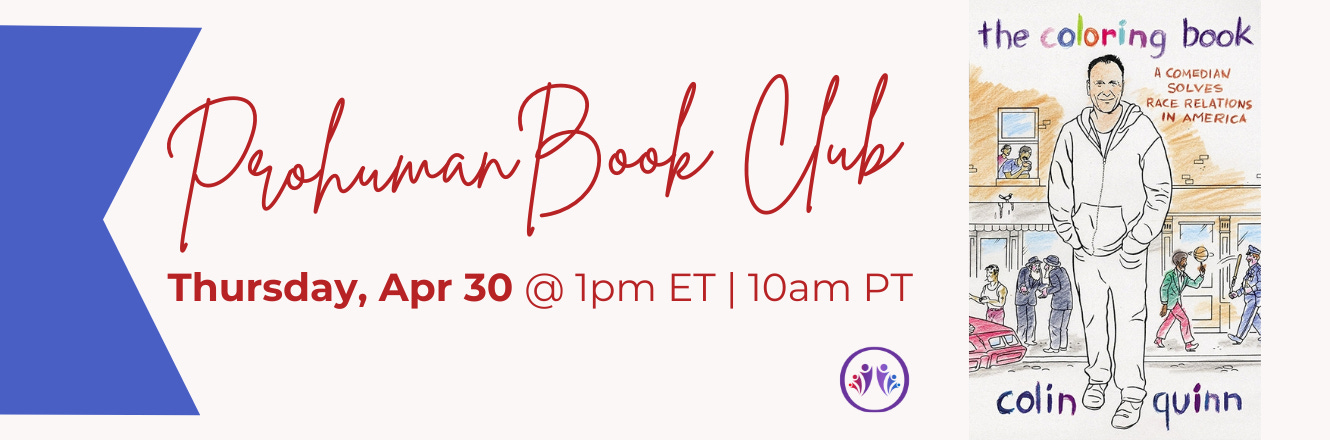 This month, the Prohuman Book Club will spotlight Coleman Hughes and Colin Quinn as they observe American race relations with clarity and wit from two distinct perspectives. We’ll begin with Hughes’ book as our primary focal point and conclude on a light, yet insightful note with Quinn’s comedic takes.